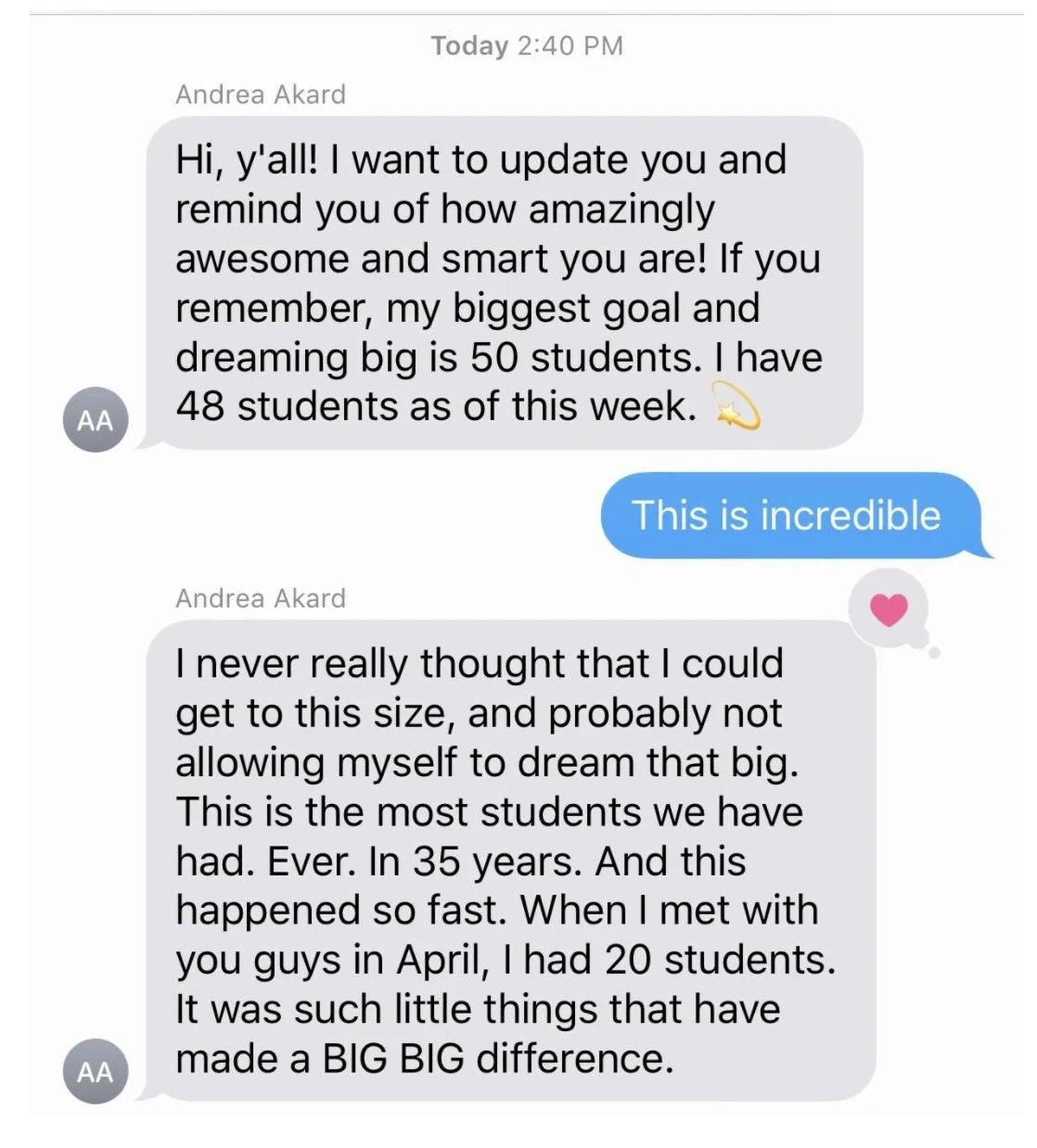 "This is the most students we have had. Ever. In 35 years. And this happened so fast. When I met with you guys in April I had 20 students. I have 48 students as of this week. It was such little things that have made a big difference."